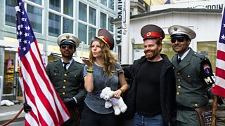 Rosie calls in to Checkpoint Charlie to have her photograph taken with the border guards.