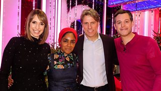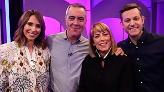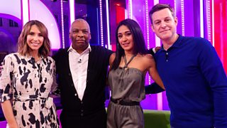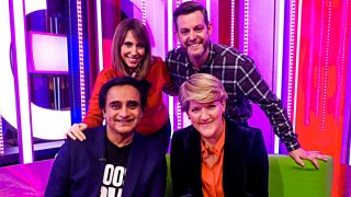 Alex Jones and Matt Baker are joined on the sofa by Stephen Merchant and Asim Chaudhry.