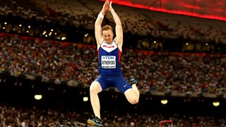 Greg Rutherford takes his first leaps as he looks to qualify for the long jump final.