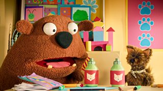 There's wet paint on the new climbing frame, and Dodge accidentally knocks into it!