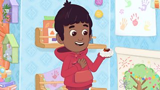 Jay tries to stay still so that Nikhil can paint a portrait of him — but it’s hard!