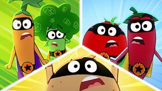 Evil Pea tries to ruin Fruit and Veggie Friends Day, but Supertato keeps stopping her.