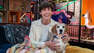 Blue Peter's Joel Mawhinney reads a story about a very grumpy dog called Gus.